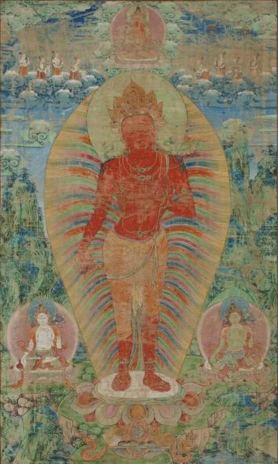 Figure 2 The Bodhisattvas Padmapani and Tara, 1700–1800, Thangka painting from China’s Hebei Province, colours on cotton (image 128.4 x 76.7 cm; overall 169.9 x 94.8 cm). Collection: Asian Art Museum, San Fransico.